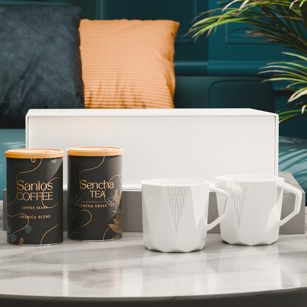A luxurious set based on thin-walled Crown mugs made of Fine Bone China is a true manifestation of prestige. Inside, it also includes selected “Santos Coffee” and “Sencha Tea” presented in elegant tins. The entire set is packaged in an exclusive, snow-white box with a magnetic closure.
